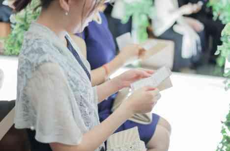 ゲストは挙式がはじまる前のチャペルにて、待合室で受け取ったおふたりからのスイッチングレターを開きました。"一人ひとりに感謝の気持ちを伝えたい"と、おふたりがこだわった演出のひとつです。挙式前に心を落ち着かせ、おふたりからの想いを静かに読む時間は、その後の挙式への気持ちを高めてくれます。そしておふたりの想いはゲストの心にもしっかりと届き、会場は温かい空気で包まれました。