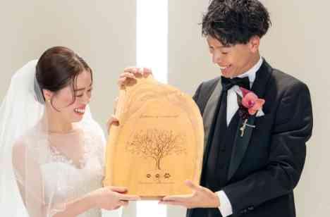 おふたりこだわりのアイテムである、木でできた結婚証明書。思わず触れたくなるような、美しい年輪や自然にできたひび割れ。それは、一本の木が長い年月をかけて大木となるまでの物語。まさに、これから結婚を誓い合うおふたりにぴったりな、世界に一つだけの木の結婚証明書です。人前式では、受付にてゲストに書いてもらった「誓いの言葉」とともに永遠の愛を誓ったおふたり。ゲストも参加型の"自然体"な人前式となりました。