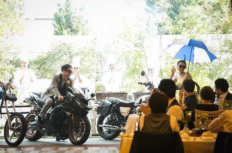 会場の入り口にはカスタムバイクを並べ、私服でゲストをお出迎えしました。カスタムバイクと一緒にゲストも写真を撮ってくれて良かったです。再入場もバイクと共にガーデンから登場!メインディッシュのBBQと合わせてインパクトがある演出になりました。