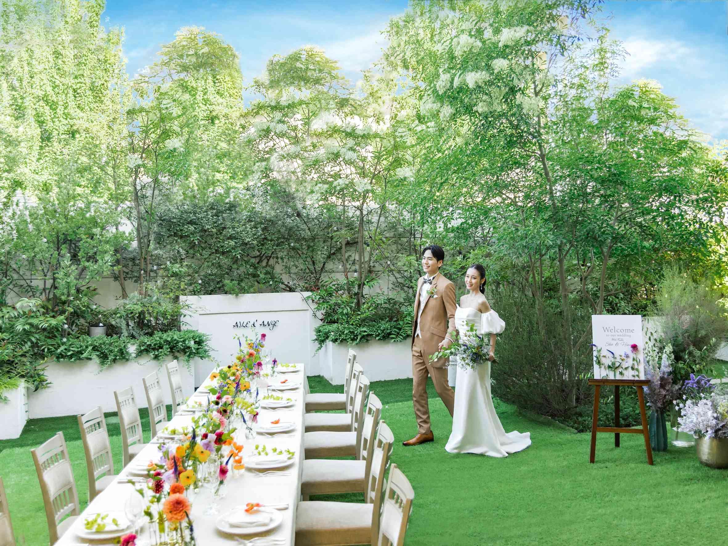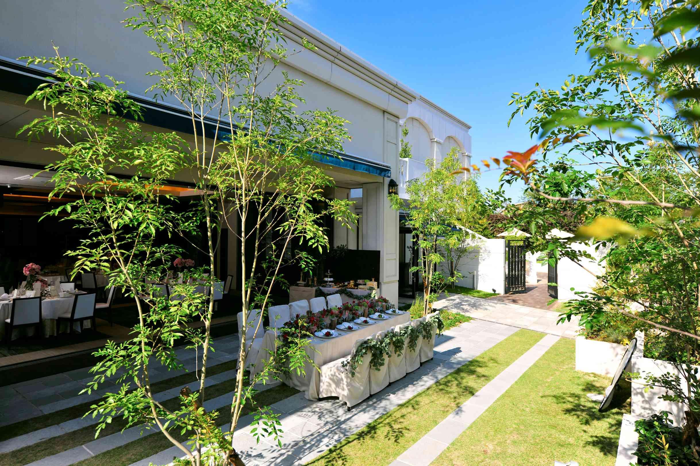ガーデンが一続きとなる、オシャレなパーティー会場。ナチュラルにも、可愛くも、大人っぽくもできる、お花やテーブルコーディネートで、二人だけの世界観に。【収容人数30~120名】