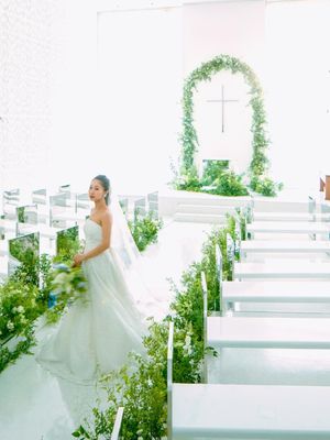 天井高6Mの窓から自然光が降り注ぐ純白のチャペル。映画館のような構造で、後方からもばっちり見えるのでゲストも嬉しい♪ またベビールームもあるので安心。