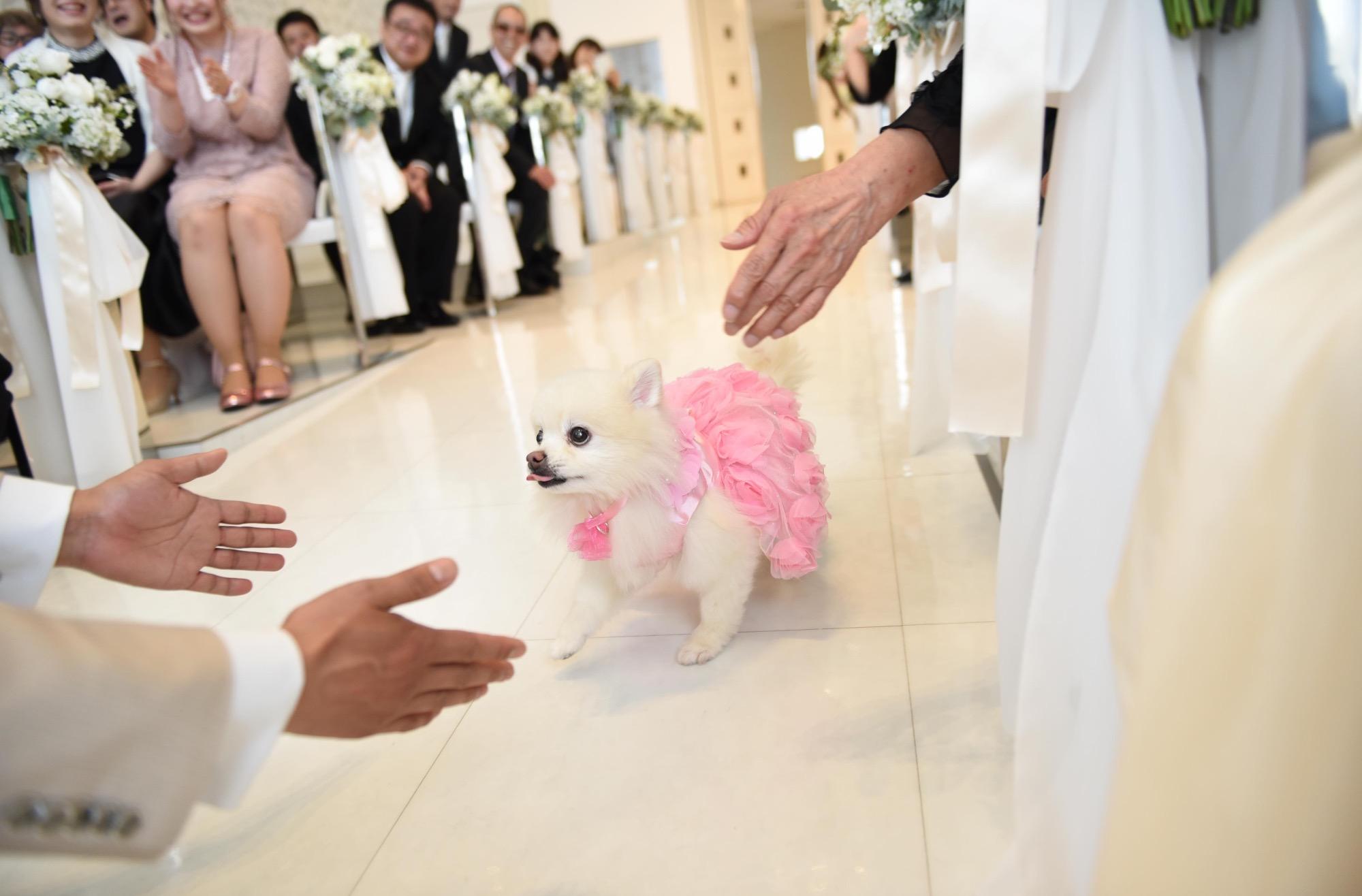 なんといってもリングドックがポイントです!(お二人) お二人の愛犬みるきーちゃんは本当にお利口さんで、 ゆっくりとバージンロードを歩いてお二人の元まで 歩んでくれました。ゲストからも可愛いと声があがり とっても素敵なシーンになりました(プランナー浜浦)