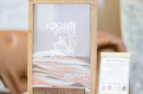 今日は『これまでで一番〇〇な日』ゲストそれぞれにそう思ってもらえるようなパーティーにしたい!おふたりの想いから担当プランナーと決めたこの日のテーマは『The〇〇dayever』受付ロビーには、ゲストに「こんなの初めて!」と喜んでもらえるアイテム『サンドセレモニー』をご準備。当日ゲストはおふたりの沖縄家族挙式の映像や写真をみながらリラックスして思い思いに過ごします。