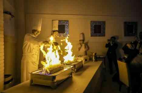 コックコート姿で再入場したご新郎様から上司の方へ『はじめての体験』をプレゼント。一緒にコックコートを着て頂きメインディッシュを仕上げます。コックおふたりのドキドキ感、炎の演出がゲストの皆様を惹きつけます。お料理では、まるで玉手箱のようにふたを開けると煙がもくもく出てきたのは…カエル!?の可愛らしい人形。笑ってほしい!今日はかしこまらずのびのびと、そんな思いを込めておふたりからのサプライズです。