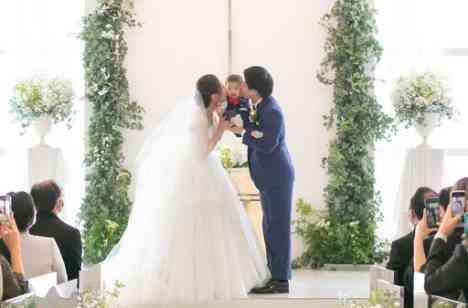 一足先にチャペルでご新婦様を待つご新郎様。振り向きその美しいお姿に思わず涙が溢れます。そのお姿を挙式前に親御様にも最初にみてほしい。その想いは感謝の気持ちがあるからこそ。人前式でリングボーイの大役を担うのはおふたりのお子様。誓いのキスもパパとママの間に入ってバッチリです!可愛らしい主役の大活躍にゲストもほっこり温かい人前式。ガーデンでは名古屋名物『お菓子まき』全員がありのままのお姿で大盛り上がり!
