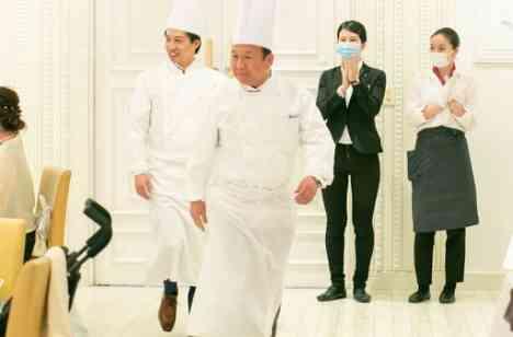 蓋を開けると煙と共に登場するお料理。そんな中プロテインバーが登場したゲスト様。バーを両手に大喜びの瞬間をおふたりはご自身のカメラで早速パシャリ!かけがえのない記録を今日はたくさんカメラに収めます。メインディッシュでは炎の演出。目の前でフランベしたのはご新郎様とお父様。コックコート姿がキマってノリノリです。幼いころ週末はお父様がお料理を作ってくれていて、お父様への感謝の気持ちを特別な演出で伝えます。