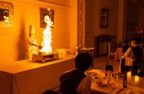 シェフが皆様の目の前で炎の演出!メイン料理を豪快にフランベし盛り上げます。その後もカットから盛り付けまで、臨場感とゲストの五感を刺激する大人もお子様も大注目の演出です。他もおふたり専属のシェフと打ち合わせを重ね、ゲストの喜ぶ顔を思い浮かべながら作ったおふたりだけのオリジナルフルコース。ゲストが召し上がる直前に仕上げ、お皿の温度にまでこだわり最高の状態でご提供いたします。