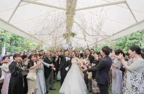 挙式後は緑に囲まれるガーデンでゲストをお出迎えし、皆んなが気兼ねなくおふたりのもとへ集まります。集合写真はキラキラ輝くスパイダーシャワーで祝福感あふれる素敵な1枚。お菓子まきで更に盛り上がり楽しい時間を過ごします。続く披露宴の始まりはご新郎様の力作オープニングムービーです。お打ち合わせではいつも進捗を楽しそうに教えてくださいました。夢中になり作る事を心から楽しんだムービーがゲストの心を動かします。