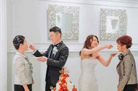 ウェディングケーキでお声がかかったのはご両家のお母様。手元にずっと残る物を…とネックレスも贈ります。ケーキや物に想いをのせて『今までありがとう』おふたりらしい子育て感謝状の演出で 4人共通のかけがえのない想い出ができました。中座ではお姉様と幼馴染にエスコートをお願いしました。涙と笑顔が溢れお互いの想いが交差する瞬間。そんな3人のお姿を見てゲストにもそして親御様にも涙と笑顔が連鎖します。