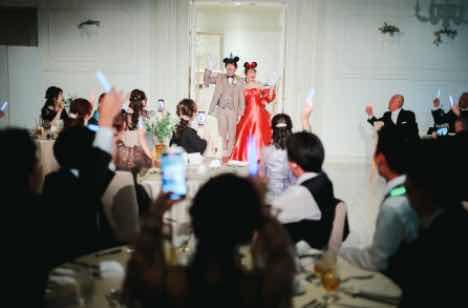 再入場では耳を澄ませ扉に注目するゲスト。手にはBGM当てクイズのペンライト!おふたりがご入場すると会場内はまるでパレードのように楽しい一体感がうまれました!みんなでワイワイ楽しみたくて歓談の時間も大切にした披露宴。お写真タイムは高砂席にすることでゲストが自由に会場内を歩き回り、皆んなが自然体で過ごすこともできました。今日の非日常感が心の中で色褪せる事のない想い出となるような素敵な時間になりました。