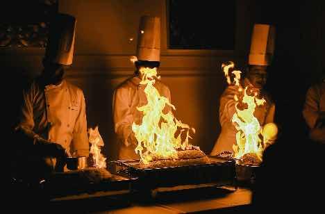 ご両家のお父様がいらっしゃるのは、今まさに披露宴のお料理をお作りしているキッチンの中。コックコートに着替え1日限りの特別シェフに!装い新たに3人でご登場すると会場には驚きの歓声と拍手が沸き起こりました!炎の演出フランベも見事大成功!お父様のご活躍でメイン料理がより一層特別感のある一皿に仕上がりました。