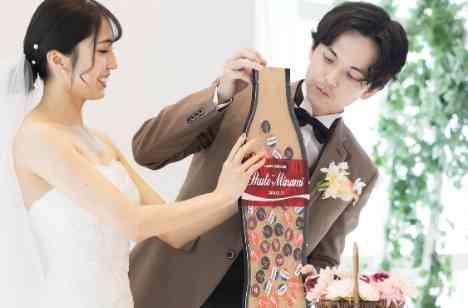 コーラが大好きで 「コーラといえば◯◯だよね」と言われるくらいコーラのイメージが強いおふたり。そんなおふたりは、大好きなものを掛け合わせて、おふたりにしかつくれないおしゃれな世界観を生み出していました。待合室でゲストと一緒につくった結婚証明書は、大好きなコーラの瓶を形どったもの。人前式の中でおふたりが瓶の蓋を入れて完成し、おふたりはゲストに見守られながら永遠の愛を誓いました。