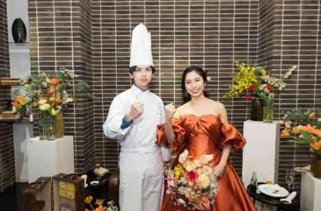おふたりが楽しみにしていたキッチン中継。キッチン内と会場を中継で繋ぐと、そこに登場したのはまさかのご新郎様!サプライズ感あふれる演出で、ゲストも期待に胸が膨らみます。キッチン内でつくっていたのは、結婚式では珍しい"餃子"。家庭の味がおふたりとも"餃子"ということにちなみ、両家の味を再現して振る舞おうと考えたおふたり。いつになく真剣な表情で餃子を準備するご新郎様の姿に、会場内は大盛り上がりでした。