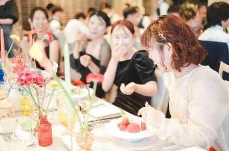 お料理を通しても"こんなの初めて"と感じてほしいという想いがあったおふたり。ゲストのために考えた世界にひとつだけの オリジナルフルコースでは、気兼ねなく楽しんでほしいという想いから、お箸で食べられるお料理も準備しました。食材や調理法、盛り付けにもこだわったお料理は、幅広い年齢層の方々に大好評。そして 、お料理を使ったサプライズも!"キオク"に残る演出にゲストにも笑顔の輪が広がりました。