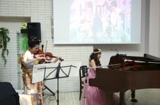 披露宴では、新郎がギターを新婦がピアノを生演奏しました。「2人がこの音楽の仕事に就けたのも家族や恩師のおかげ」というお2人の想いからカタチになった演出でした。その感謝の気持ちを、お2人らしさを一番表現できる音楽にのせて届けて頂きました。ゲストの皆様が楽しんで頂く事も忘れておらず、プロジェクターの映像に合わせた心のこもった生演奏となりました。