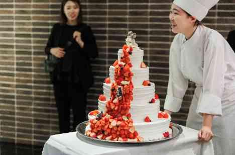 「結婚式らしいウェディングケーキ入刀」に憧れていた新婦様。パティシエとの打ち合わせを重ねて完成したのは、五段重ねの存在感あふれるいちごのウェディングケーキです。お二人の愛犬と愛猫をデコレーションに取り入れたのも、さりげないこだわりポイント。当日、ケーキに入刀される瞬間のお二人の眩しい笑顔が、とても印象的でした。