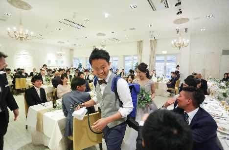 ビールが大好きな新郎がお色直しをした後にビールサーバーを持って登場し、ビールサービスを行いました!!またサプライズの一つとして、それぞれの席に参列者をイメージした漢字一文字の書いた木箱(中には引き出物のコップ入り)を準備しました。