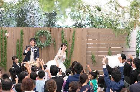 ガーデンセレモニーで行ったお菓子撒きと、披露宴で行った炎の演出です。特に炎の演出では、真っ暗にした部屋の中で、コックコートに身を包んだ両家の父と新郎の3人でフランベをしました。その後、両家の母にも参加してもらい、お手本バイトをしました。普段なかなか見ない演出だったので、ゲストからも大好評でした。