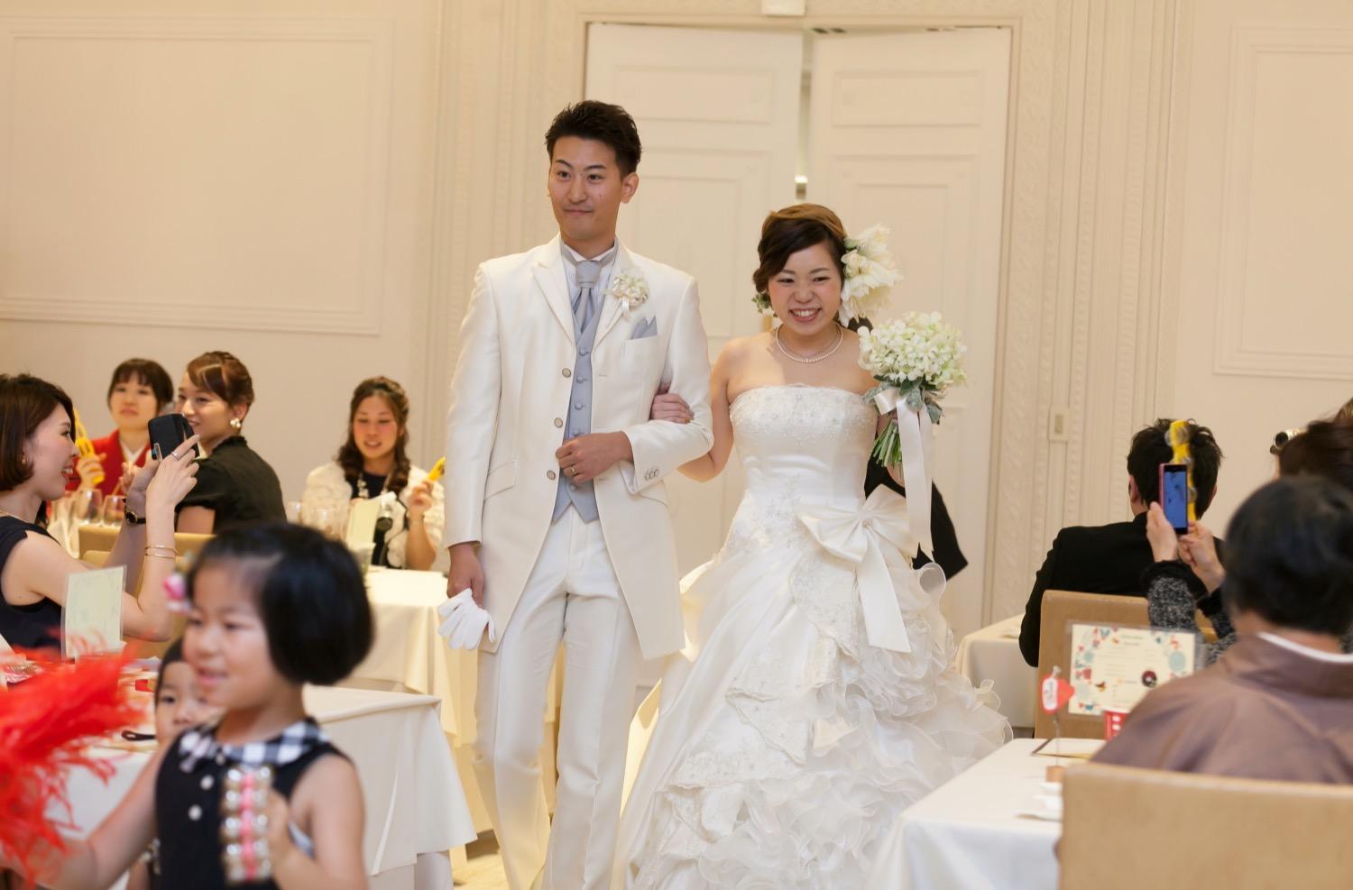 入場は新郎新婦ともに大切な両親と一生にバージンロードを歩いたり、ウエディングツリーでみんなに承認をしてもらったり、友人に歌を歌ってもらったり、参加型の挙式になりました。リングガール、リングボーイを甥っ子と姪っ子にやってもらたら、当日ちょっとしたハプニングもありましたが、みんなが笑顔になっていい思い出です。