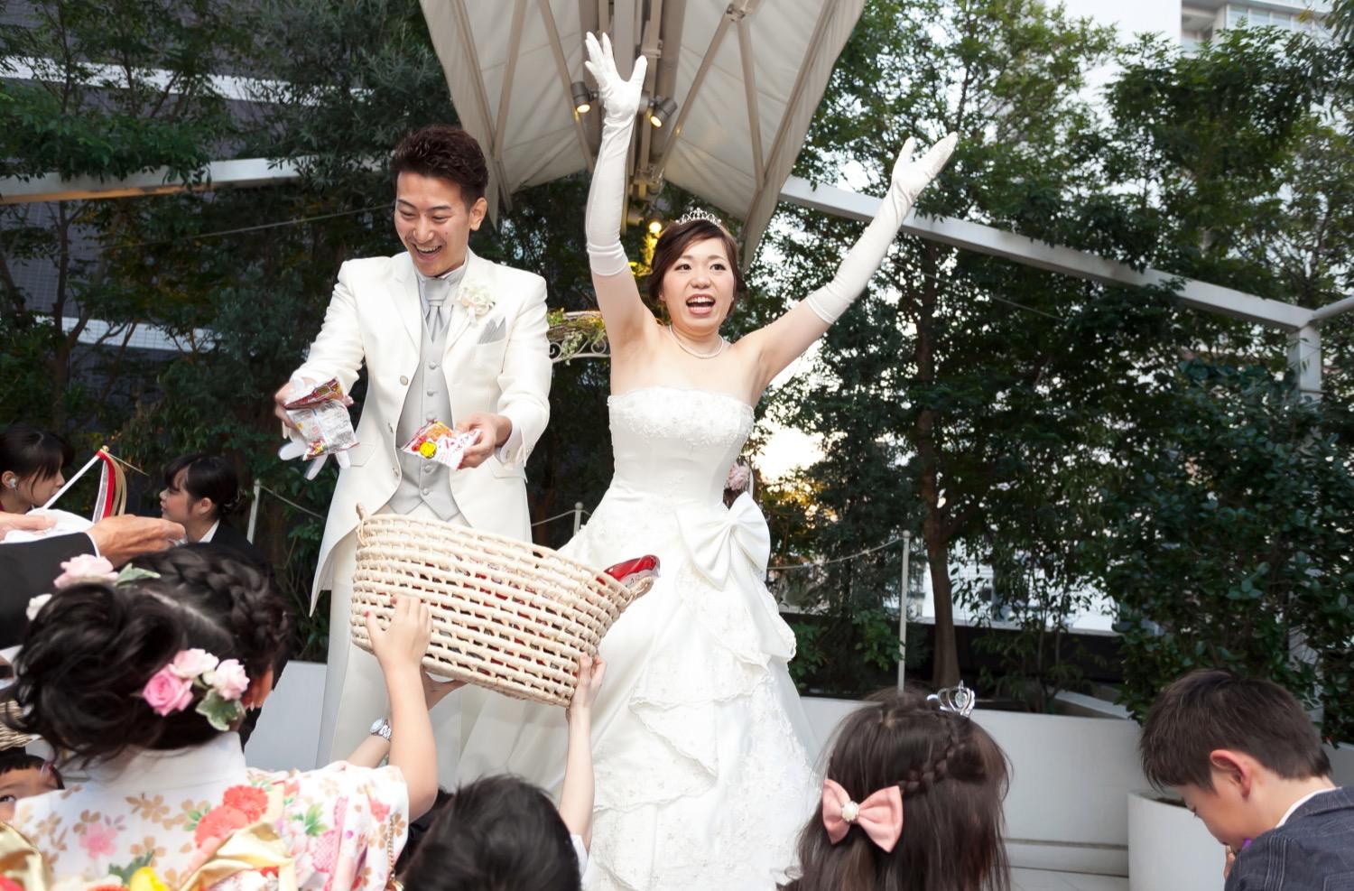 ガーデンではお菓子まきだけでなく、紅白饅頭を配りました。披露宴ではピアノの生演奏と子供の誘導 クリスマスソングでの入場はとても楽しかったです。各テーブルに鈴などをおき、みんなが楽しんでもらえるように工夫も。また披露宴中にはビストロ風のコールをしたり式場のスタッフにも協力をしてもらいました。料理演出の注目は新郎が行ったフランベ!!両親には感謝の気持ちを込めてウェイトベアをプレゼントました。