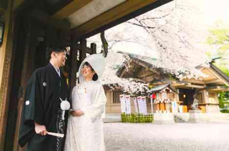 当日はあいにくの雨となりましたが、東郷神社の境内に咲き誇る桜をバッグに撮影致しました。 やさしいピンク色が白無垢にもとても映える、春らしい1枚となりました。また、雨天だからこそ境内はおふたりのみとなり「貸し切りでの」お写真撮影もお楽しみいただけました♪石造りの本殿では雅楽の生演奏に加え、静かに雨音が響き、一層厳かな雰囲気の中での神前挙式となりました。