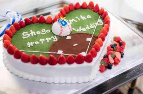 学生時代から野球を続けてこられたご新郎。 野球を通じて知り合ったご友人が多数いらっしゃることや、ご新婦ともよく野球観戦のデートにいかれたとお打合せでお話くださいました。 新郎ゲストの記憶にも残るケーキをデザインしたいというお気持ちから、球場をモチーフにおふたりが応援されている球団のロゴを入れたケーキをご用意。入刀シーンでは男性ゲストからも歓声があがり、大盛り上がりでした♪