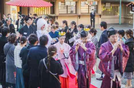 庭園から厳かに始まる参進の儀。 迫力ある雅楽演奏につられ、緊張の面持ちで歩まれる新郎新婦のふたりも、境内に到着をすると親しい友人やご親族に迎えられてとほっとした笑顔になります♪ ふたりのために集まった皆様からは、「おめでとう!」と次々に祝福の声が掛けられ、ゲストとの絆を感じられる時間が流れました。