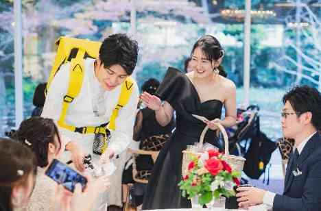 披露宴が和やかに進む中、新郎が黄色いアイテムを背負いご挨拶まわり! ふたりがゲストへのおもてなしに選んだのは【ビールサーバー】でのテーブルラウンドです。ゲストへ新婦がカップとおつまみを配り、新郎が生ビールを注いでいきました♪ひとりひとりに感謝の気持ちを伝えながら、サービスする演出に会場は大盛り上がりです!