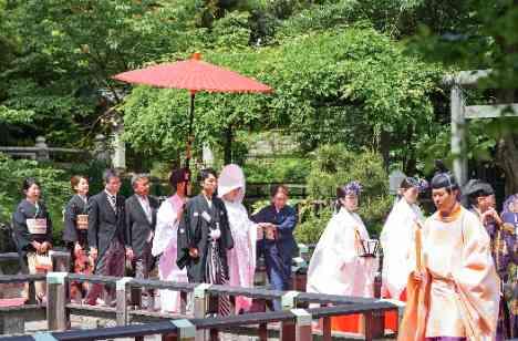 東郷神社最大の魅力は、四季折々の自然に囲まれた日本庭園から始まる“お庭からの参進”。 鯉が泳ぐ池や滝、折橋など、趣深い景色が広がるなかで、厳かな挙式への歩みが始まります。 自然の息吹を感じながら、本殿での儀式に向けて心を整える貴重なお時間となり、非日常の神聖な空気に包まれた特別な一日の始まりです。
