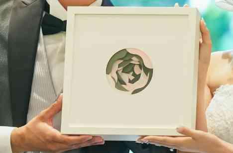 色や形の異なるカードにゲストの皆様からのメッセージを一枚一枚いただき、それらを重ねてボックスに収めた、おしゃれで温かみのある結婚証明書。 カードの一部をくりぬいて作られた席札は、テーブルコーディネートのポイントに。 大切な一日とゲストの想いを感じる素敵な証明書を目の当たりにし、お二人とも感激されておりました。
