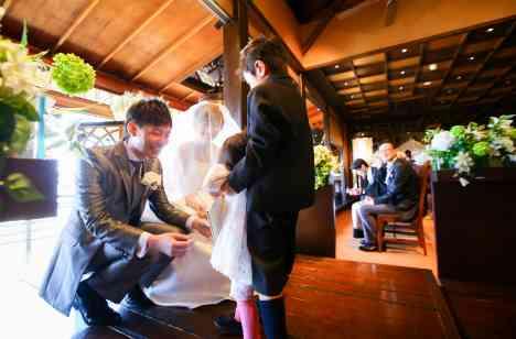 リングボーイ、誓いの言葉を持ってきてもらう役目をお子様たちにお願いしたり、証人には婚姻届と同じくお互いの父にお願いしました。 みんなに見守られながらの人前式ならではの演出ができて、本当に良かったです。