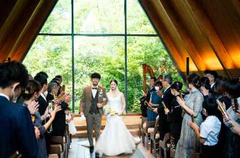 お二人が選ばれたのは、木の温もりと豊かな緑に包まれたチャペルでの人前式のスタイル。上品なマーメイドドレスに身を包んだご新婦様。ゲストとの距離感を一番に考え、挙式の最後には全員での集合写真も残しました。ゲストからは大きなクラッカーで祝福され、はじける笑顔いっぱいのあたたかな式を叶えることができました。