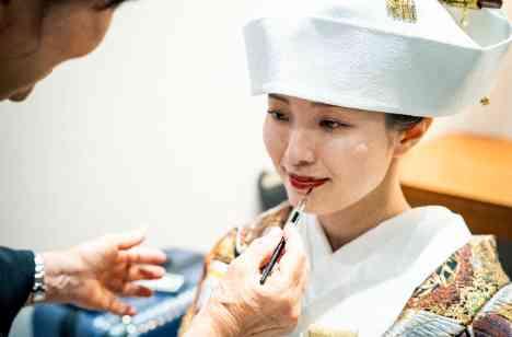 お色直しは和装で色打掛を選ばれ、ご新婦様がこだわられたのは文金高島田のヘアスタイル。大正・昭和の時代にタイムスリップしたかのような歴史的な建築物との雰囲気も相まって、気品あふれる凛とした上品な髪型に、親御様はじめゲストの皆様から歓声があがりました。お母様からの紅差しのシーンもつくり、記念のお写真もしっかり残されました。