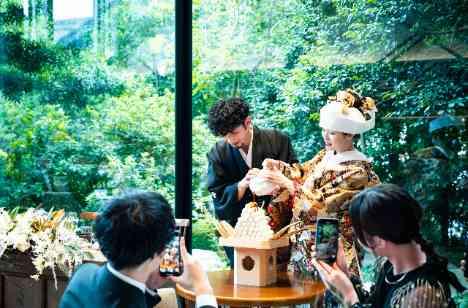 披露宴ではゲスト参加型のクイズを行ったり、テーブルごとにお写真を撮る時間もたっぷり作り、ゲストとの関りを多くとりました。また、和の衣装にちなんだみたらし団子ドリップの演出も、初めて見るゲストは興味津々!デザートと一緒にお団子の提供まで行い、高宮庭園茶寮ならでは&お二人らしい演出を心ゆくまで楽しんで頂きました。