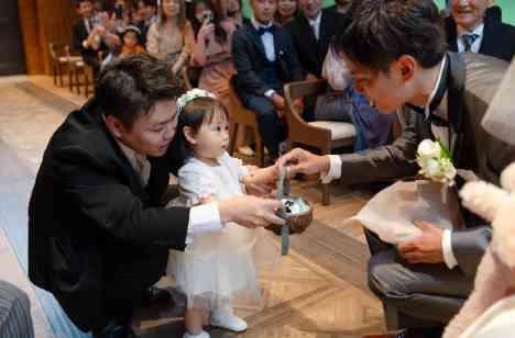 挙式の中でお子様にリングガールとしてお手伝い頂きました。リングピローの中にはペンギンがお二人の大切な指葉を守ってくれています。会場全体があたたかく見守ってくれ、心温まるセレモニーでございます。大役を務めて頂いた後は、お二人のお気持ちの詰まった感謝のプレゼントをお渡しし、とっても素敵な笑顔でお写真を撮影致しました。
