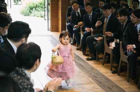 挙式ではお子様にリングガールをご依頼リハーサルの際とは違い、たくさんのゲストの方がいらっしゃることに驚きながらも一生懸命に指輪をお二人の元へと運んでくれました。大役の後にはお二人からお礼のプレゼント。とてもかわいらしいお時間となりました。ご退場時にはフラワーシャワー・バブルがんをご準備されとても幻想的なシーンとなりました。