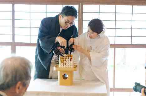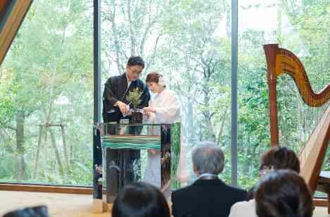 挙式は高宮庭園茶寮だからこそ行える、チャペルでの和装人前式をご選択。気の温もりを感じて頂けるチャペルでは、和装もとても素敵でございます。セレモニーにはご両家の実家のお水を持ち込んで頂き、水合わせの儀を行いました。それぞれの環境で育った二人が、一つの水に交わることで、新しい家庭を築く決意を表ていただきました。