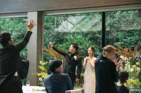 お色直し後には、会場の皆様と一体感ができるようじゃんけん大会を実施。小さなお子様にも楽しんで頂けるようご用意。勝ったお二人には素敵なプレゼントをご準備されていたお二人。会場の皆様に参加いただきとても一体感が生まれるお時間となりました。 その後は、ゲストの皆様とのお写真撮影の時間をご用意。ゲストの皆様にメインテーブルに来ていただき、お写真をゆっくり残して頂きました。