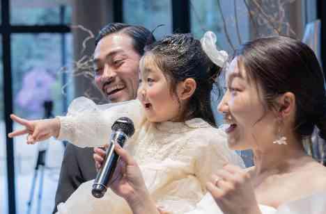 再入場は、ご家族3人でとまとの被り物を着用。とまとちゃんの音楽にあわせてご入場されました。 ご家族らしい入場に会場は大盛り上がり。ゲストの皆様も被り物を着用していただき写真撮影とても楽しいひとときとなしました。ご入場前の皆様の楽しそうで、ノリノリな表情もとても印象的です。ご入場にカップル様らしさを取り入れて頂くとオリジナルを感じていただけます。
