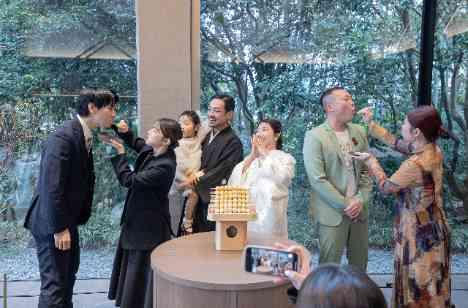 ケーキ入刀に代わり、お二人はみたらしタワーを選択。お団子に、みたらしの餡をドリップ。和装に合わせたオリジナル演出を実施。お二人のドリップを一番近くで見守るお子様。大切なお子様に見守られながら、ファーストバイトを実施。お二人の大切なご家族、 新郎様の妹ご夫婦・新婦様いとこ夫婦もバイトを実施。 会場全体があたたかな一体感となりました。