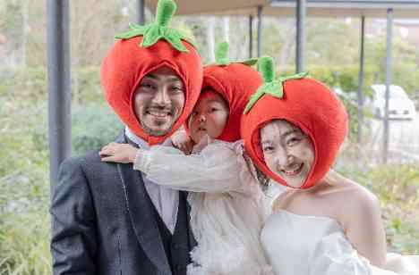 再入場は、ご家族3人でとまとの被り物を着用。とまとちゃんの音楽にあわせてご入場されました。 ご家族らしい入場に会場は大盛り上がり。ゲストの皆様も被り物を着用していただき写真撮影とても楽しいひとときとなしました。ご入場前の皆様の楽しそうで、ノリノリな表情もとても印象的です。ご入場にカップル様らしさを取り入れて頂くとオリジナルを感じていただけます。