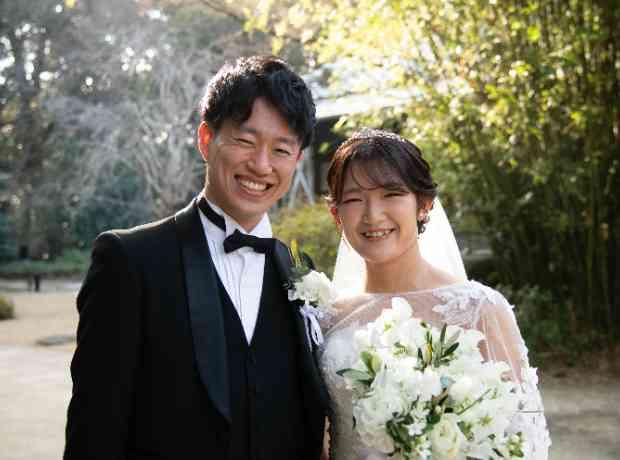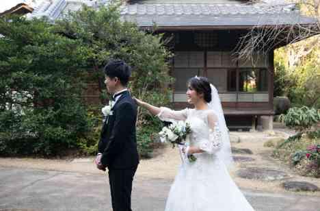 お衣装お召しになられてのファーストミート。チャペルで行うことが多いですが、洋室でのご結婚式では庭園にて実施。挙式前は緊張される方が多いですが、ファーストミートを行うことで二人の緊張が和らぎ、リラックスした状態で挙式に臨めます。より自然なお二人でのひと時となり、お写真に残る表情もとても素敵です。 四季で移り変わる日本庭園の中での、ファーストミートは高宮庭園茶寮ならではのお時間となります。