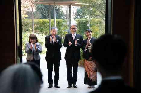 挙式前には、これまでお二人を大切に育ててくれた親御様とのファーミリーミート。木の温もりを感じていただけるチャペルにて実施。お二人も、親御様の反応を楽しみにされながら、親御様はお二人のハレ姿を楽しみに。それぞれの想いで胸を躍らせる瞬間です。扉が開くとそこにはお二人の姿が....親御様のとても嬉しそうで、そして幸せそうな表情。拍手でお二人を祝福される姿。とてもあたたかなお時間となりました。