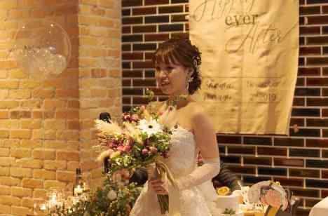 お二人とゲストの方が近い距離だからこそアットホームに歓談を楽しみながらのパーティーをご提案。 お二人のお持込アイテムをふんだんに使って きれいに装飾されたお二人の高砂にお集まりいただいてお話をしていただく時間を大切にしております。 大切な友人だからこそ、いつもの距離でお話ができる、自然と笑顔があふれるご結婚式となりました。