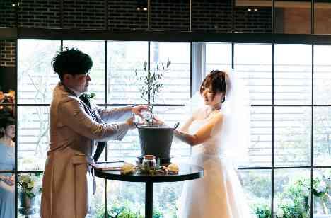 ご参列されるゲストの方々へ愛を誓う、人前式。 自由度が高いからこそ叶えられる、ご挙式からたくさんの演出を盛り込みました。 植樹の儀では受付時にゲストの方より予めオリーブの苗に土を入れてもらいます。 その苗にご挙式の中でお二人よりお水を注いで完成させます。 ご挙式後はウェルカムスペースに飾っていただいたり、お家に持ち帰り皆様からの気持ちが詰まったオリーブを育てることもできます。