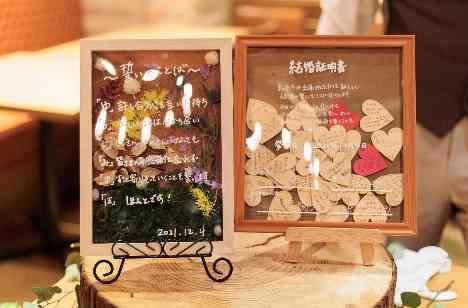 手作りが好きなご新婦様。ご結婚証明書も手作りされ、ご披露宴では結婚証明書を使ってウッドドロップのBOXを作成。また、誓いの言葉はお二人のお名前を使ったあいうえお作文になっています。 装飾として飾れるようにデコレーションしたお花はなんとご新郎様のお母様からもプレゼントのお花とのこと。 ゲスト想いのお二人だからこそ心温まるような演出を添えて。