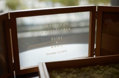 結婚証明書はおふたりが交わした誓いの瞬間を、美しい花とともに形に残す特別な証です。 透明なボックスの中に咲く花々は、 その日その瞬間の想い、祝福、そして未来への願いを映し出します。 署名された結婚証明書は、ただの書面ではなく、 人生を共に歩む決意そのもの。 そんな瞬間を大切なゲストとともに・・・世界にひとつだけのウェディングメモリー
