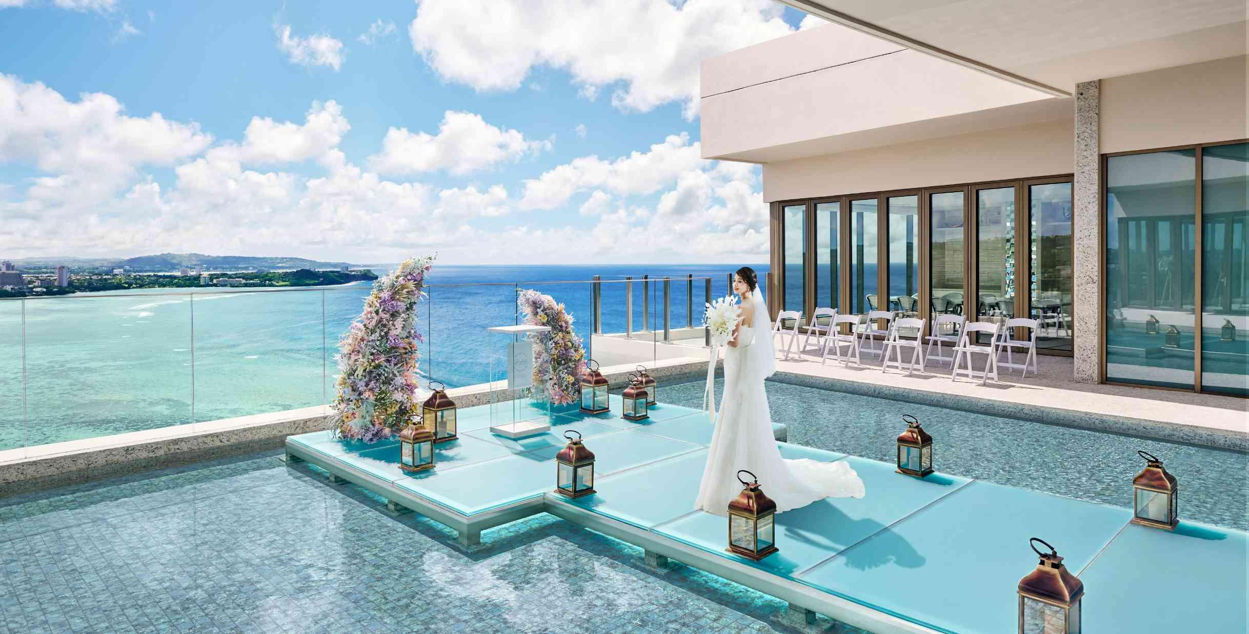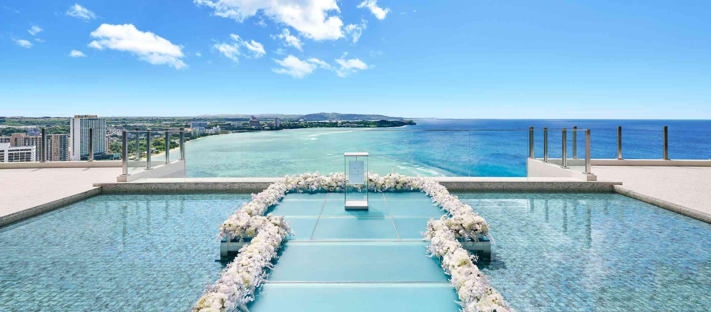 タモン湾で一番高い丘に建つ最新ホテルの27階最上階が誓いの舞台。お好みのスタイルでつくる世界のひとつのウエディングをご堪能ください。