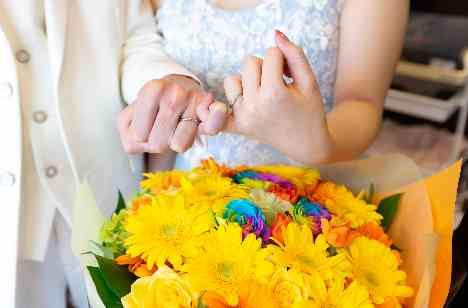 お花がお好きな新婦様 会場装花やブーケにはとってもこだわりを 取り入れて素敵なお花をご用意いたしました。 またご披露宴後には新郎様から新婦様へ 素敵なサプライズ花束をプレゼント!! 新婦様のお好きなお色味と3本のローズを束ねてプレゼントされたとのこと…! おふたりのご結婚指輪とともに思い出の1枚をお撮りいたしました♪