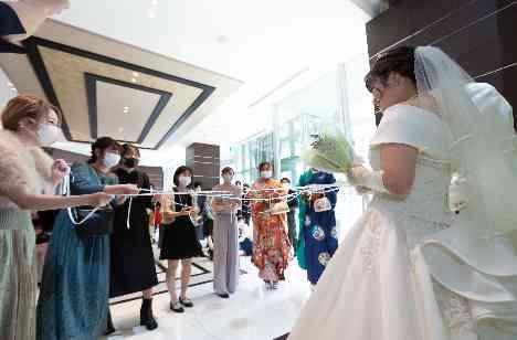 挙式後、当館のホールにて女性ゲストを集めブーケプルズのセレモニー!1人1本の紐をひっぱり当たるのは誰か…!?おふたりは挙式後にホールにて女性ゲストのみをお呼びいたしましてブーケプルズを行いました。ブーケトスとは違い、皆さま全員参加型でひっぱるまで誰が当たるか分からないドキドキの演出です(^^)/